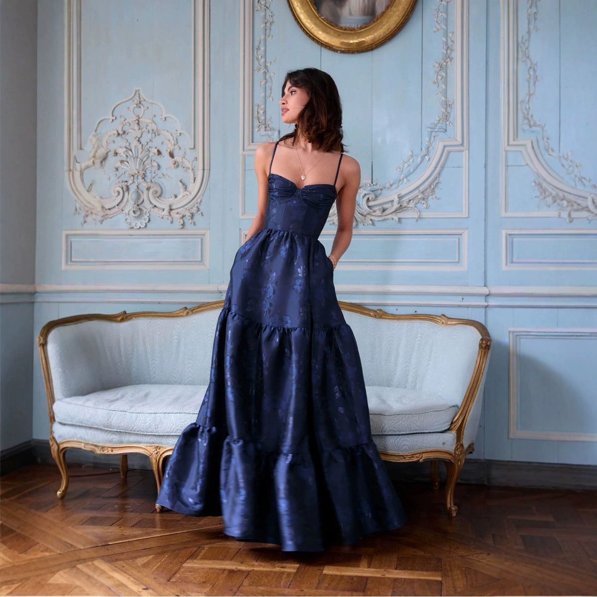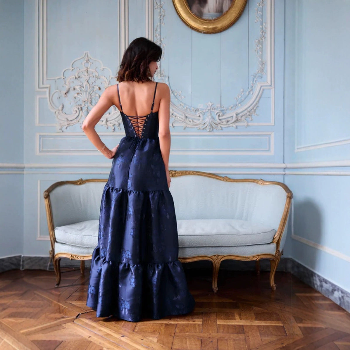 Lace-up Waist Mesh Jacquard Sling Dress